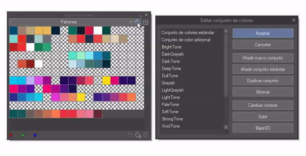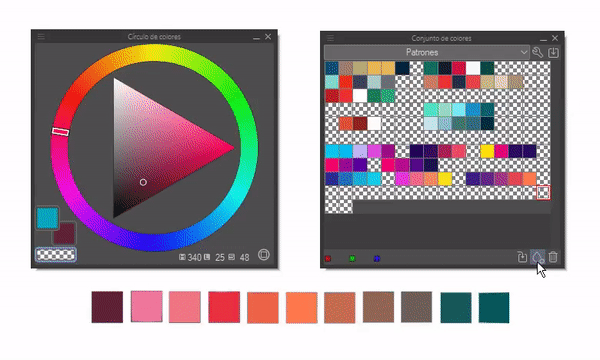 Cet outil est très important car il nous permet de sauvegarder les palettes de couleurs que nous souhaitons. En bas à droite, il y a trois fonctions qui servent à : remplacer la couleur, ajouter une couleur, supprimer une couleur, ce qui nous permet de remplir et d'organiser la palette de couleurs que nous souhaitons créer. J'utilise cette fonction pour stocker les palettes de couleurs que j'ai créées et que je souhaite conserver pour une réutilisation ultérieure.