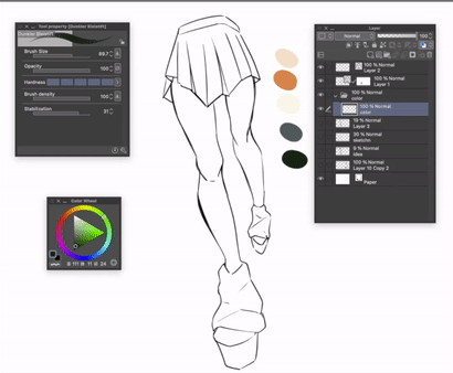 Pour l'ombrage, je commence normalement par des ombres à bords nets et je les adoucis ensuite. J'en ai ajouté sur les jambes, surtout sous la jupe, et aussi sur les vêtements. Pour ne pas peindre en dehors des lignes, j'ai sélectionné l'icône de double calque dans le menu des calques. Cela vous permet de dessiner uniquement sur le calque inférieur. Nous l'utiliserons aussi pour la lumière.
