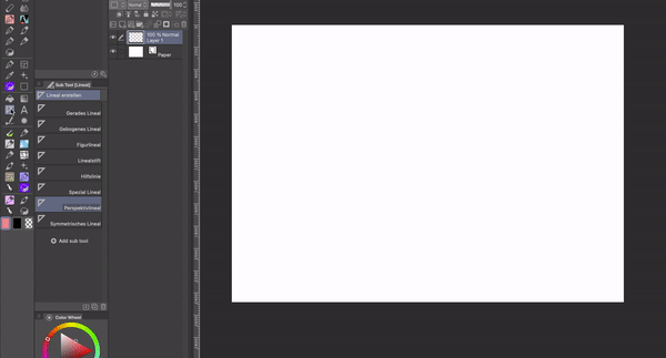 Vous cliquez sur l'icône et pouvez ensuite tracer deux lignes sur la toile pour définir votre point de fuite. Maintenant, vous pouvez tout dessiner dans la bonne perspective.