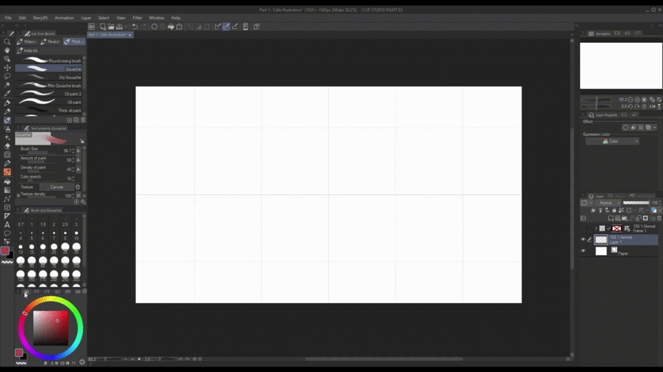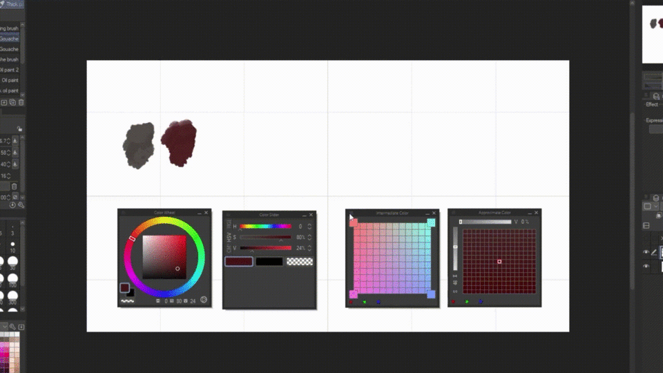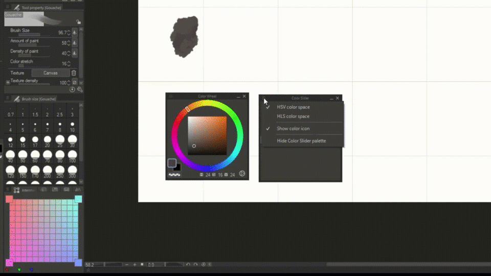 Contrary to the traditional idea of what a ‘palette’ is, the different tools enclosed in boxes at the corners of the screen are all called palettes in CSP. And as you could guess, all color-related palettes are called color palettes. Subsequently, the arrangement of these palettes makes up the interface, more commonly known as the workspace.