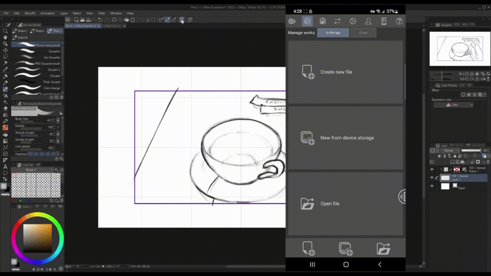 Now click this new icon that doesn’t appear in the phone. This will let us use the same subtool as the one we’re using in the canvas. In this case, it’s the round mixing brush.