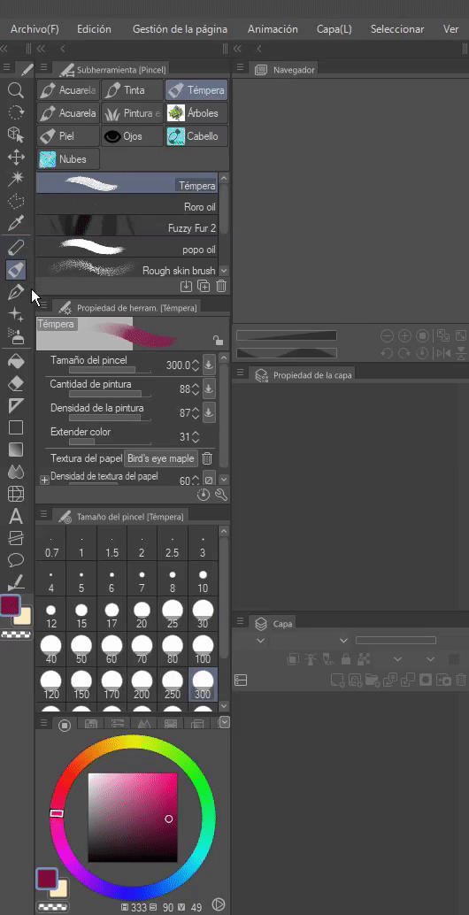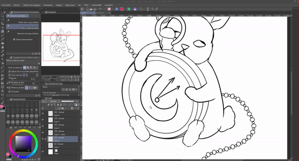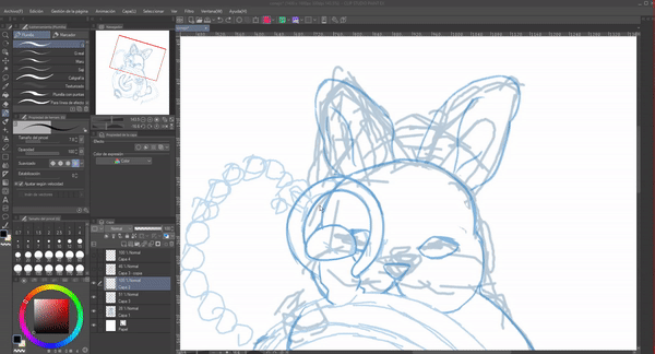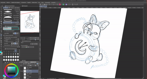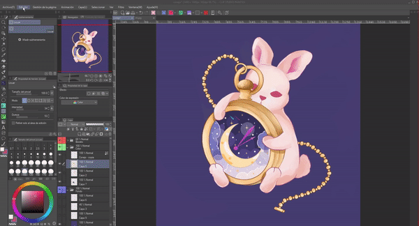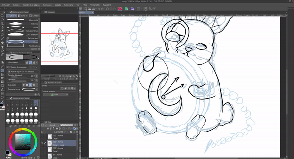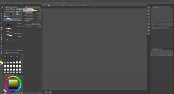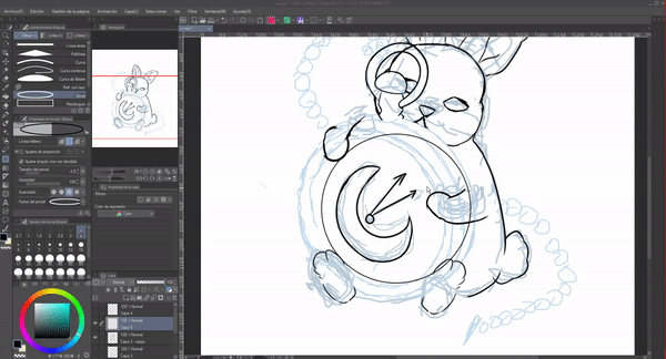 D'autres outils importants sont ceux qui contrôlent la toile, dans ce cas la rotation, l'agrandissement, la réduction et l'inversion. Ces outils fonctionnent comme nous le ferions normalement en dessin traditionnel, où nous déplaçons constamment le papier pour trouver une manière confortable de dessiner. Ces fonctions se trouvent sous la fenêtre "Navigateur".