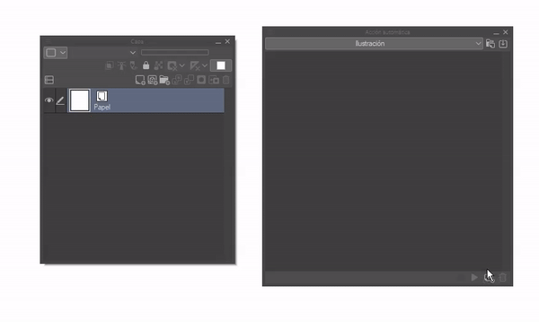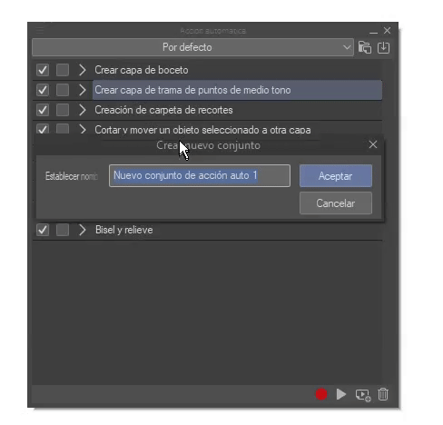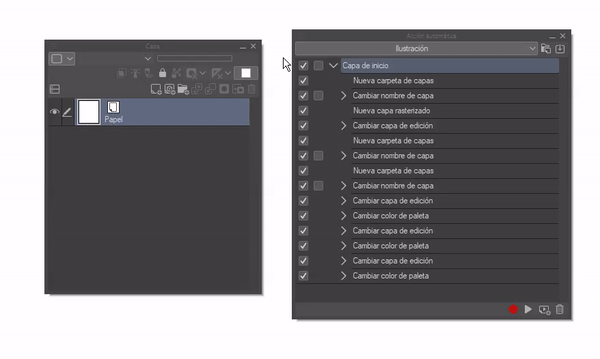 Pour démarrer l'enregistrement, nous cliquerons sur le cercle rouge situé en bas de la fenêtre. Une fois cela fait, nous commencerons à effectuer l'action que nous souhaitons enregistrer ; je vais créer une série de calques et de dossiers que je génère toujours lorsque je démarre une illustration, je leur donnerai le nom et les couleurs avec lesquels j'identifie chaque dossier. Pour terminer l'enregistrement, nous cliquerons sur le carré rouge en bas de la fenêtre.