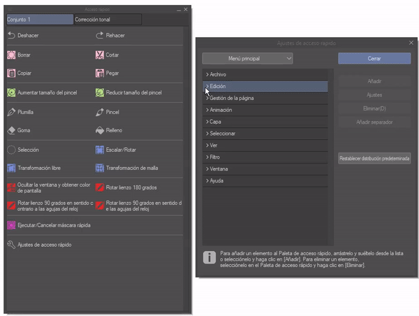 L'option "Paramètres d'accès rapide" permet d'ajouter et de supprimer, mais surtout, c'est ici que nous pourrons ajouter les outils qui ne peuvent pas être ajoutés par simple glisser-déposer, comme les couleurs ou les fonctions de bordure ; je suis une personne qui change beaucoup la taille de la toile pendant le dessin, c'est pourquoi c'est une fonction primordiale pour moi, mais ce n'est pas une fonction que je peux simplement faire glisser dans la fenêtre d'accès rapide, c'est pourquoi je dois la trouver et l'ajouter via les "Paramètres d'accès rapide". De plus, comme dans la barre de commandes, nous pouvons attribuer une couleur aux icônes, la procédure et les options sont les mêmes.