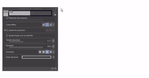 Tous les outils ont des propriétés qui leur confèrent plus de praticité. Par exemple, nous pouvons créer une figure remplie, ajuster les proportions, l'opacité, le lissage ou la forme du pinceau. Dans ce dernier cas, nous avons l'option de changer la forme de la ligne avec laquelle la figure est créée, normalement c'est une ligne droite, mais si nous avons un pinceau qui dessine une portée musicale, la ligne changera pour cette portée.