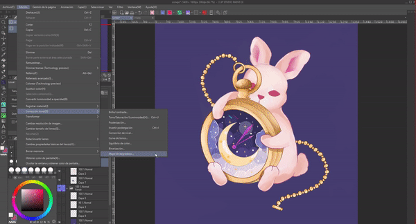 La façon dont je les utilise est la suivante : premièrement, après l'encrage, les couleurs sont très ternes, j'utilise donc la fonction "Luminosité et contraste". Si, pour une raison quelconque, les couleurs ne me conviennent pas, je les change avec la fonction "Teinte/Saturation/Luminosité", ou si je veux essayer des couleurs avec d'autres nuances, je fais des tests avec les cartes de dégradé. Ces trois-là sont celles que j'utilise le plus, ce sont donc celles que je vous présenterai ensuite.