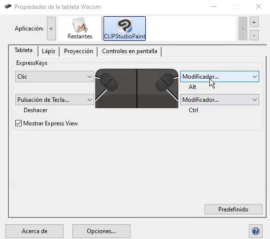 Nous pouvons faire la même chose avec les boutons du stylet. Sur mon stylet, j'ai deux boutons, l'un que j'utilise pour la pipette (L) et l'autre pour diminuer ou augmenter la taille du pinceau (AltCtrl). Dans ce cas, Alt et Ctrl sont des caractéristiques spéciales qui ne peuvent pas être définies seules, la pression de touche ne le permet pas, mais l'option "Modificateur" permet d'ajouter ces deux touches spéciales, il suffit de cocher la case de cette touche, dans le GIF on peut voir la fenêtre de cette fonction.