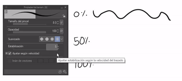 Il arrive souvent qu'au début, notre tracé soit tremblant ou, dans d'autres circonstances, pour des raisons de santé, nos mains ne soient pas dans leur état optimal, ce qui rend difficile de faire des tracés constants lors du dessin. La fonction de stabilité permet de réaliser des tracés fermes quelles que soient nos conditions. Cette fonction se trouve dans les propriétés des pinceaux.