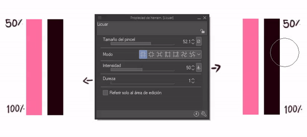 Dans les propriétés de l'outil, nous trouverons cinq sections qui serviront à choisir : la taille, le mode, l'intensité, la dureté et la référence à la zone d'édition.