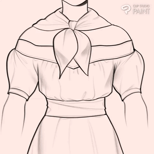 Pour faciliter le processus de coloration, un lineart propre et détaillé est très important ! Nous y tracerons les lignes des plis qui nous serviront de guide pour l'ombrage ! Il est recommandé d'utiliser des lignes dures et sombres sur les bords/extrémités des vêtements, tandis que pour les petits détails (comme les boutons, les coutures, les plis), nous utiliserons un pinceau avec une faible opacité.