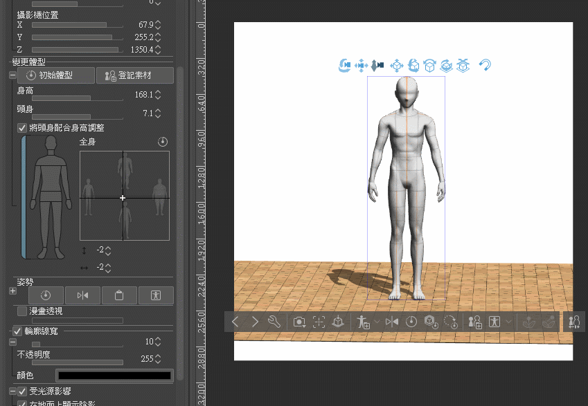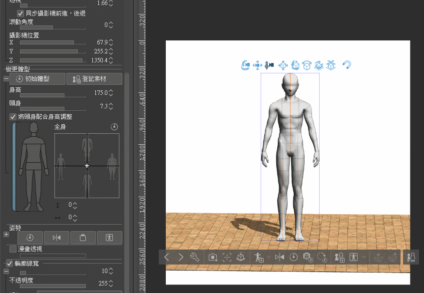 En sélectionnant un modèle 3D, vous trouverez les champs de contrôle d'ajustement du type de corps dans le panneau Propriété de l'outil ou le panneau Détail de l'outil secondaire.