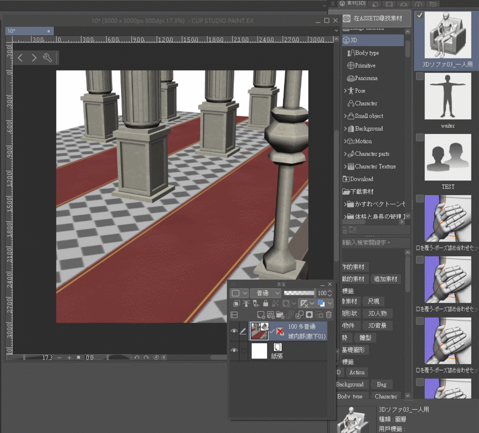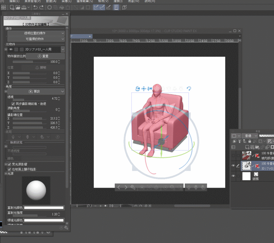 Ou bien, insérer la scène 3D dans le calque où se trouve la 【personne assise sur le canapé】.