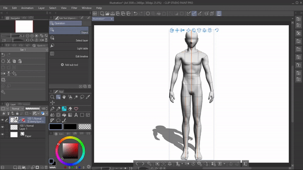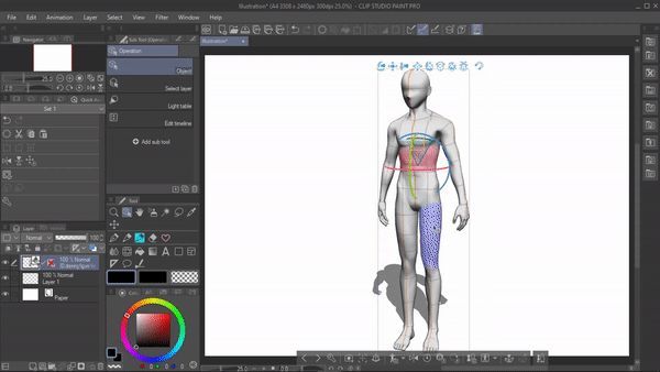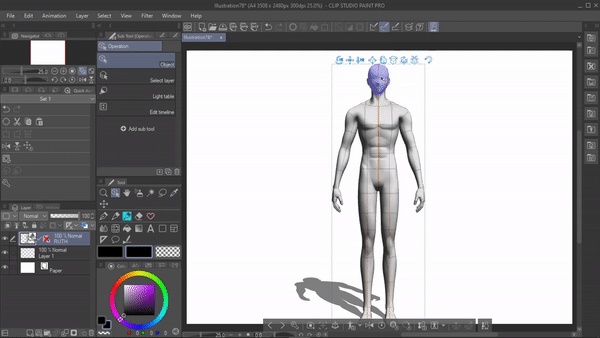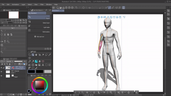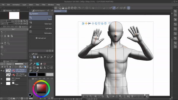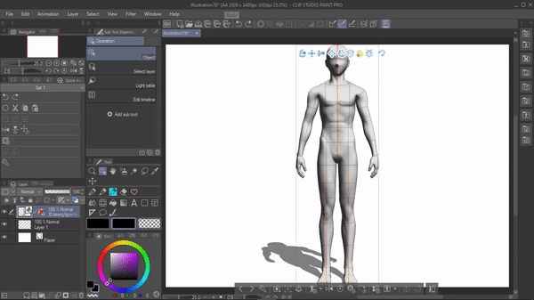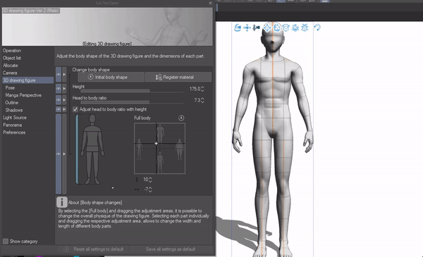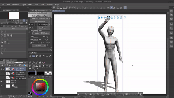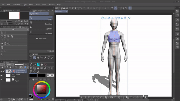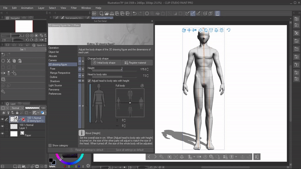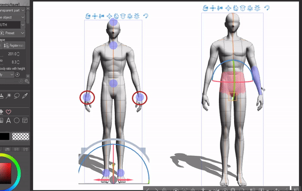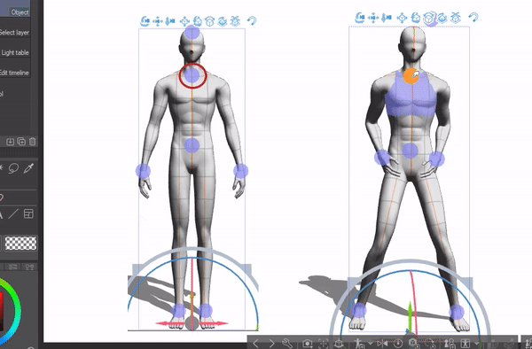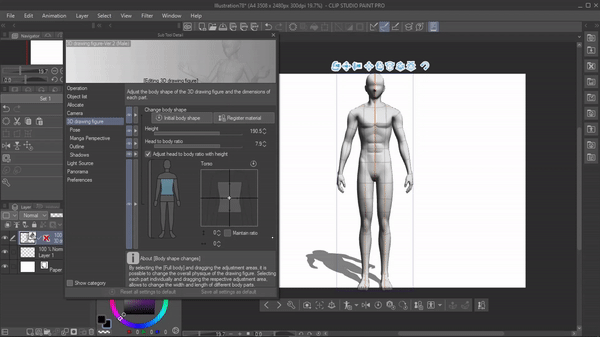 Dans CSP, nous pouvons personnaliser la forme du corps des modèles 3D pour qu'elle corresponde à la description du personnage que nous dessinons. Par exemple : je vais modifier la forme de ce modèle 3D pour l'adapter à l'un de mes OC qui a une carrure musclée et plus grande avec des épaules larges.