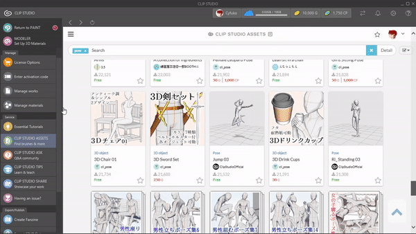 Nous avons également les ressources Clip Studio, qui contiennent de nombreuses poses différentes disponibles, il suffit de rechercher la pose que nous cherchons et de les télécharger.