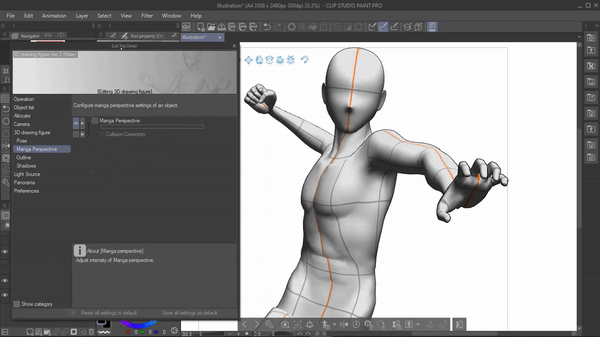 Vous pouvez trouver le paramètre de perspective manga sous « liste d'objets à afficher » > perspective manga ou dans la propriété de l'outil.