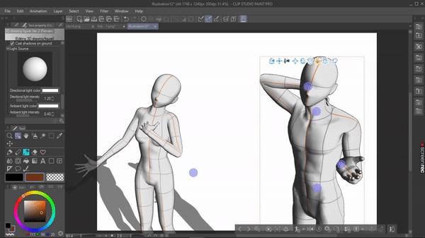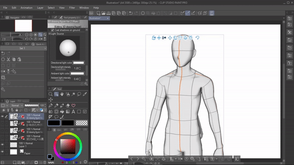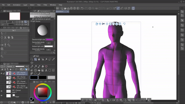 Il existe une fonctionnalité intéressante appelée source de lumière dans Clip Studio. Grâce à elle, nous pouvons modifier la direction de la lumière qui frappe le modèle 3D.