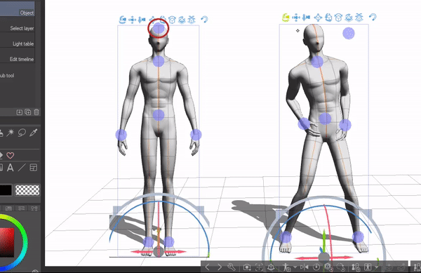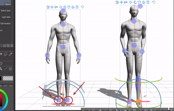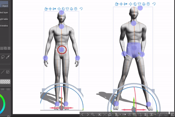 Lorsque nous cliquons sur le modèle 3D, ces 7 points apparaissent. En utilisant ces points, nous pouvons déplacer les membres et le torse de la figure 3D pour effectuer des mouvements de base. Il suffit de cliquer sur le point et de le faire glisser pour déplacer la partie du corps.