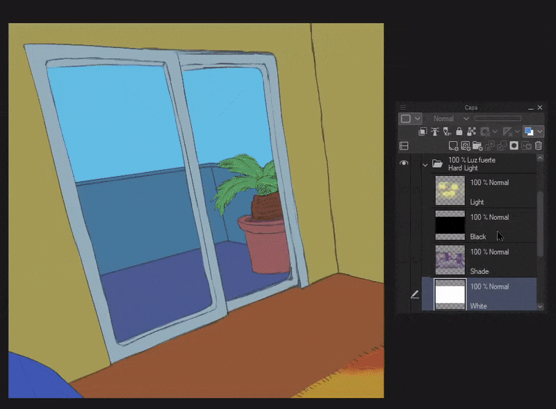 Et pour l'ombre et la lumière, créez un groupe de calques avec le mode de fusion ''Lumière Dure'' : un calque pour la couleur d'ombre violette et l'autre calque pour la couleur de lumière jaune. Voici un exemple en GIF de la façon dont j'utilise un pinceau airsoft pour l'ombre et la lumière.