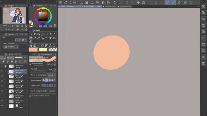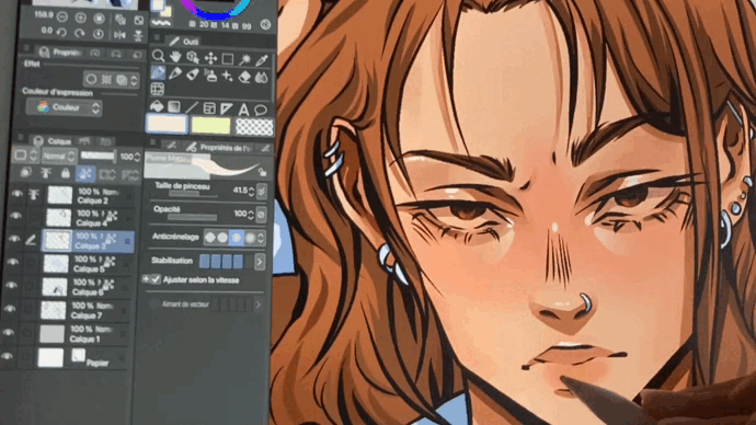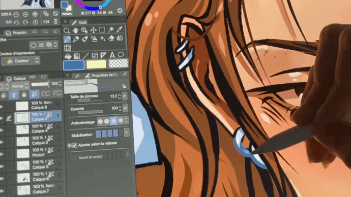 Pour finir avec l’organisation des calques, je vous conseille de cocher la fonctionnalité “verrouiller pixels transparents” (en bleu ici). Cela servira tout simplement à ne pas dépasser de votre calque, vous ne prenez pas le risque de colorier à coté.