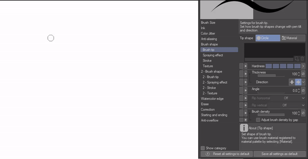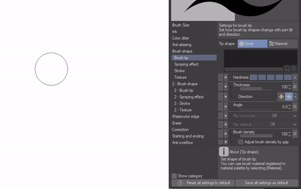 Nous avons également l'épaisseur, qui, selon ma compréhension, nous aide à définir si notre pinceau peut être épais ou plat si nous le souhaitons, et la direction décide de la manière dont la pointe du pinceau peut rétrécir, afin que nous puissions choisir verticalement ou horizontalement.