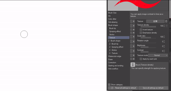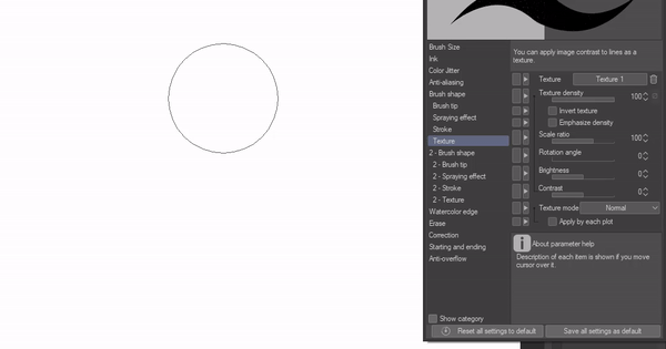 Bien, ensuite nous avons les paramètres de texture qui sont vraiment excellents pour ajouter des textures à vos pinceaux. Vous pouvez modifier la densité de la texture, c'est-à-dire la quantité de texture que vous verrez. Vous pouvez également modifier le contraste de luminosité et le mode de texture, pour un meilleur effet adapté à la façon dont vous souhaitez que vos textures de pinceau soient.