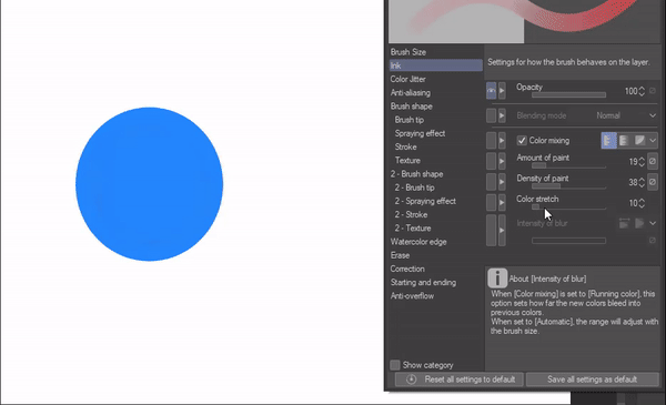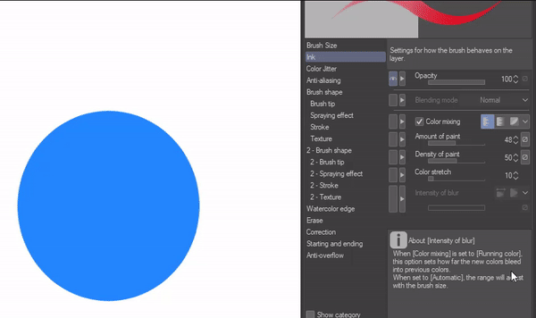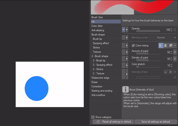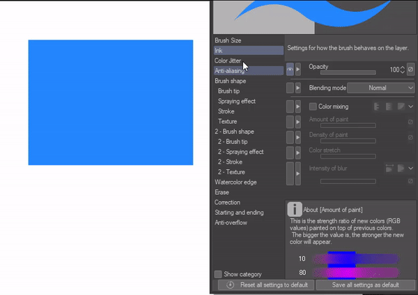 -Enfin, allez dans vos paramètres d'encre et baissez un peu votre opacité, puis activez le mélange de couleurs et réduisez également la "quantité de peinture".