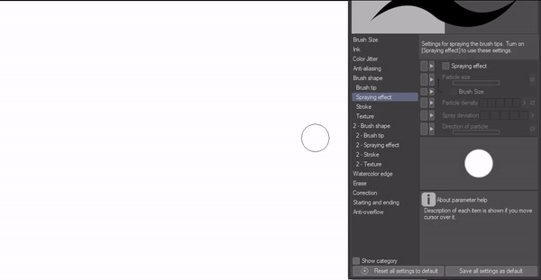 Vous pouvez modifier la taille des particules de la pointe du pinceau, la densité des particules, la déviation de la pulvérisation et la direction des particules. Jouez avec chaque paramètre pour voir comment ils fonctionnent.