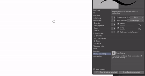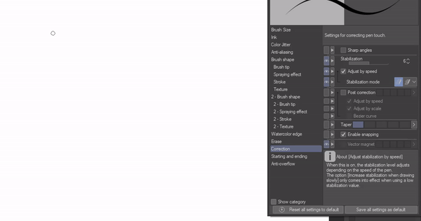 Nous avons également les paramètres d'atténuation. Lorsque vous augmentez cette valeur, vos lignes deviennent plus fines même lorsque vous relâchez votre stylet de votre tablette, c'est tout ce que je peux dire sur les paramètres d'atténuation en fait.
