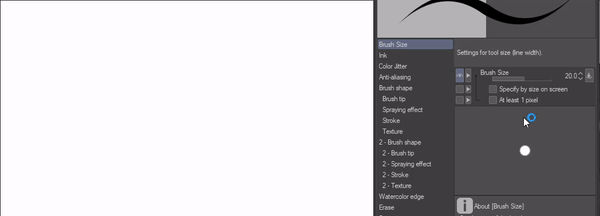 Affichons notre menu de dynamique de la taille du pinceau en cliquant sur la case à côté du curseur de taille du pinceau, à droite.