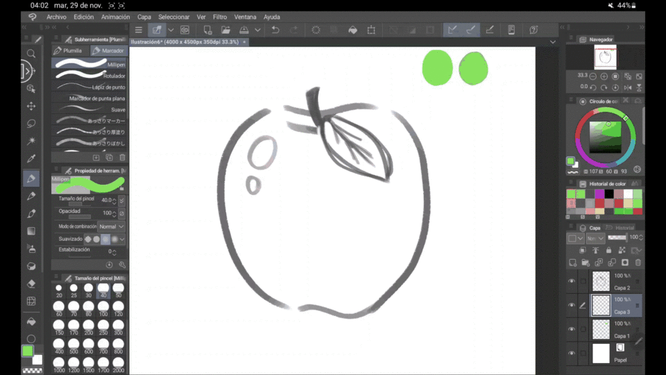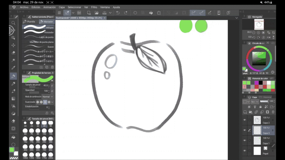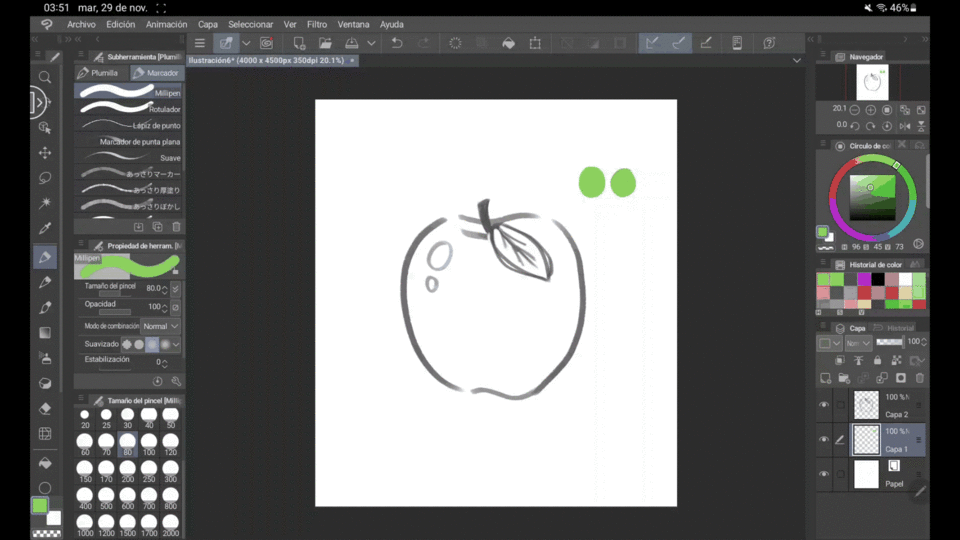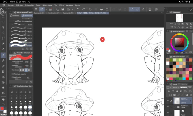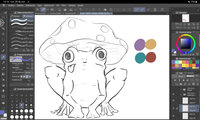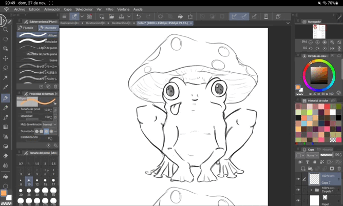 Lorsque tout est fin prêt, il est très utile pour distinguer les formes d'ajouter des lignes à notre dessin. Dans le cas de ce type d'illustrations, il est préférable d'utiliser l'outil « Milipen », que l'on trouve dans la même zone que « Plume » mais à côté, où il est écrit « Marqueurs ». Cela nous évite la « valeur » de la ligne, rendant tout beaucoup plus uniforme et plus en accord avec les « Flat illustrations ».