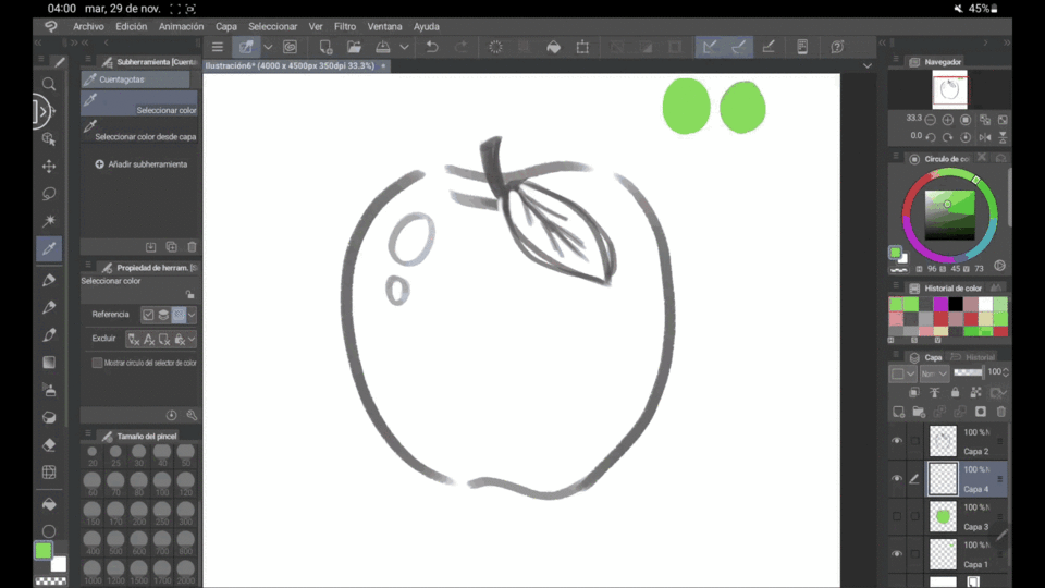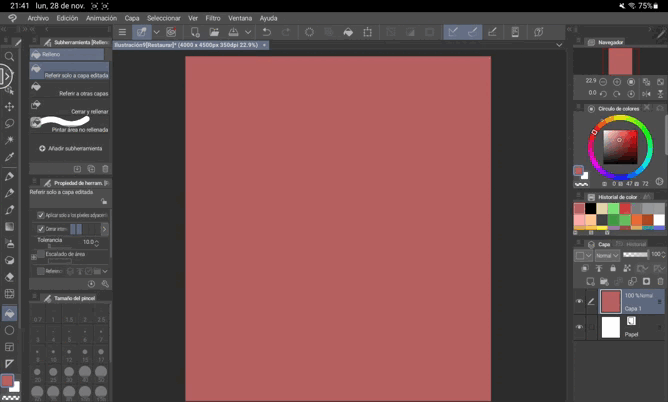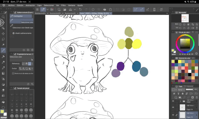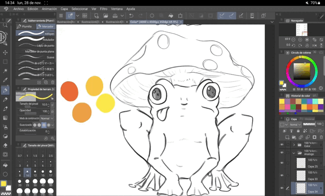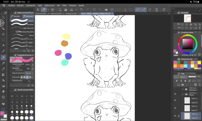 La première option consiste à réaliser un « Lineart » de notre croquis avec toutes les couleurs que nous allons utiliser, puis à utiliser l'outil pot de peinture pour tout colorer. Attention aux bords du dessin, car ils ne sont pas toujours entièrement peints.