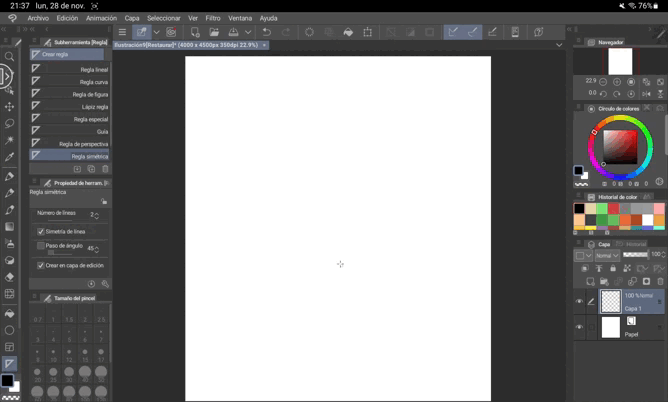 -Règle : Lors de la réalisation de notre croquis, il peut y avoir des éléments qui sont symétriques entre eux. Une façon plausible de rendre les éléments symétriques est d'utiliser la « Règle symétrique ». Avec celle-ci, nous traçons une ligne dans la direction souhaitée, de sorte qu'une fois que nous commençons à dessiner (que ce soit sur le côté gauche ou droit), les mêmes lignes seront créées dans l'autre direction. Cet outil peut nous aider surtout avec les décors, car étant des illustrations plates, le croquis a tendance à avoir une assez grande symétrie dans certaines zones.