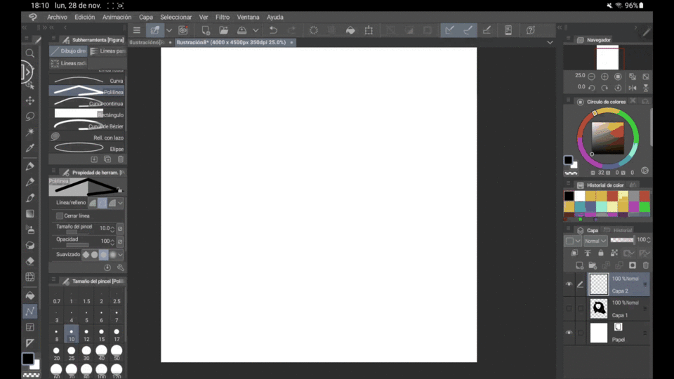 Ce que je vais vous raconter est un exercice que j'ai fait pour améliorer ma propre vision et pour m'habituer davantage à définir les formes. Avec le canevas complètement vierge, nous prenons une photo de référence et essayons de la reproduire telle quelle mais sans croquis. Nous commençons à la faire avec l'outil Polyligne, nous activons le remplissage de la ligne et nous créons la forme uniquement avec cet outil jusqu'à obtenir quelque chose de visuellement attrayant.