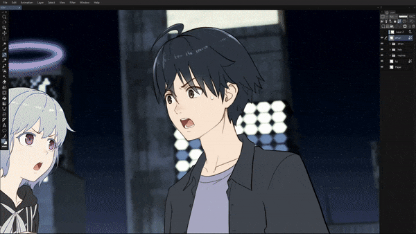 Puisque nous allons appliquer des ombrages pour la finition, ce qui est la dernière étape, la première chose à faire est d'avoir nos panneaux prêts. J'ai mon panneau prêt ici, nous pouvons voir deux personnages auxquels des couleurs plates ont été appliquées, et ils sont séparés dans leurs propres dossiers, j'ai aussi séparé l'anneau du halo. Et enfin le calque 'bg' ou d'arrière-plan que j'ai rendu dans Blender. C'est une bonne pratique de mettre les calques dans leurs propres dossiers pour rester organisé et facile à trouver si vous travaillez avec de nombreux calques. Tout le monde peut avoir des mises en page d'interface utilisateur différentes, alors ne vous y trompez pas, la capture d'écran ci-dessous est ma mise en page, je sais qu'elle semble simple et propre puisque j'utilise principalement les raccourcis clavier, mais cela n'affecte pas la fonction de base dans CSP. Nous ne parlons pas d'interface utilisateur aujourd'hui, concentrons-nous sur la fusion.