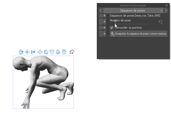 La pose est alors reflétée sur le mannequin 3D. La manipulation du [Numéro de pose] dans la palette [Séquence de poses] de la palette [Détail de l'outil secondaire] permet de déplacer le mannequin 3D.