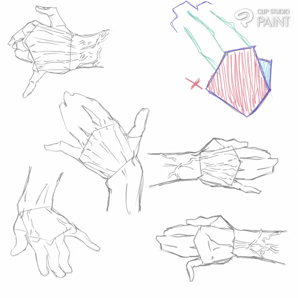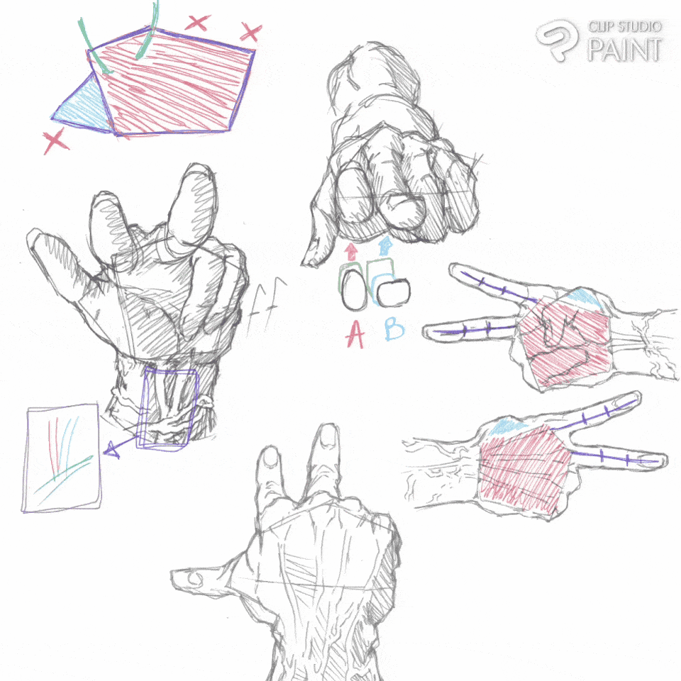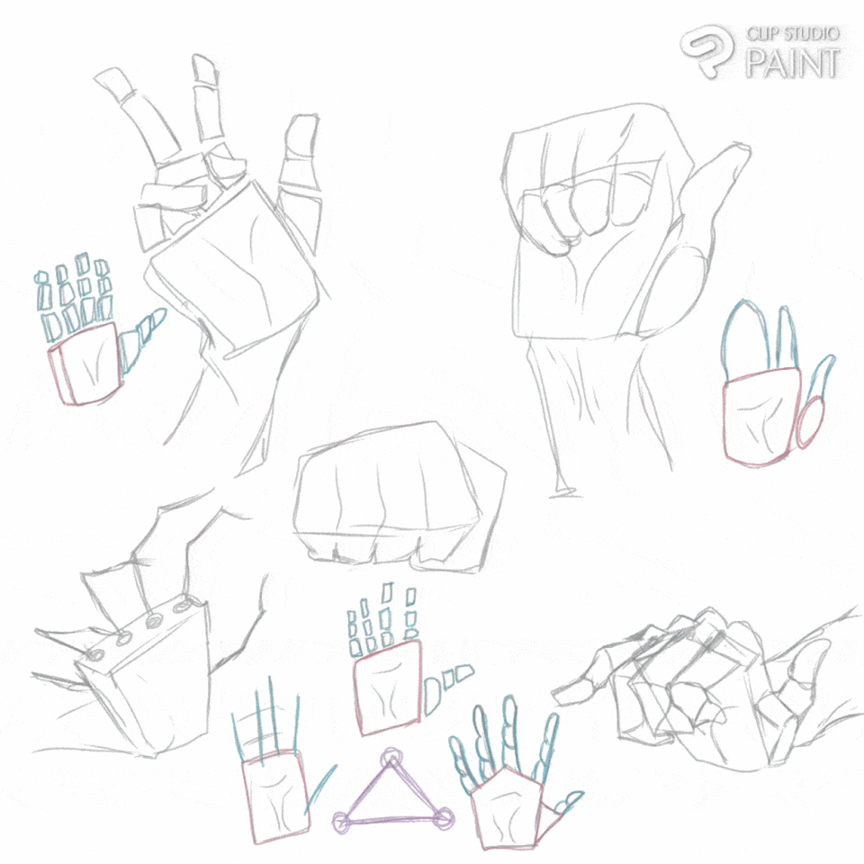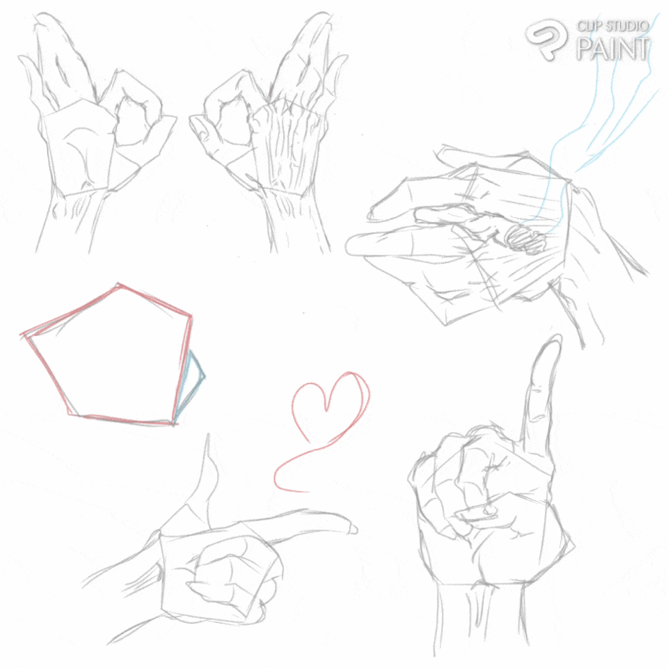 Deux des doigts en haut à gauche et deux des doigts en haut à droite se rejoignent, de sorte que l'artiste peut rapidement dessiner une expression de main.