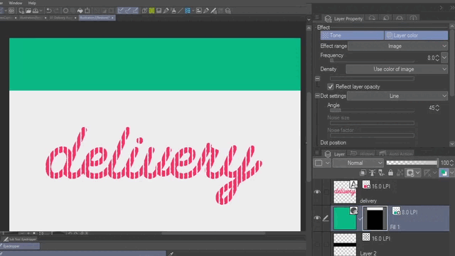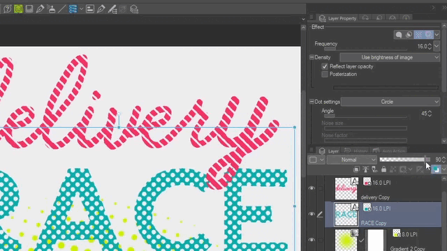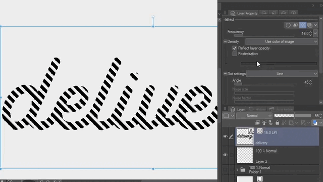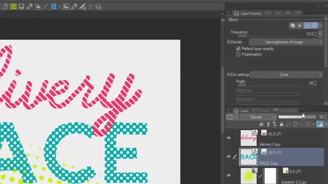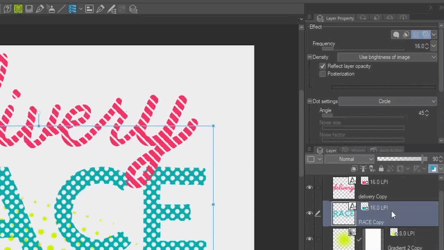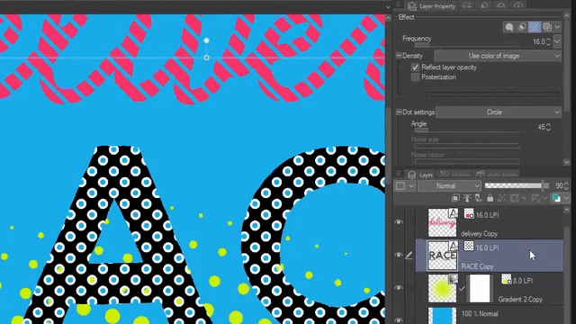 Allez maintenant dans les paramètres de point et sélectionnez Ligne. Réduisez ensuite la densité avec l'opacité du calque jusqu'à ce que vous voyiez les lignes. N'oubliez pas d'ajuster la fréquence pour obtenir des trames plus grandes ; pour cet exemple, utilisons 16.