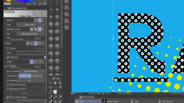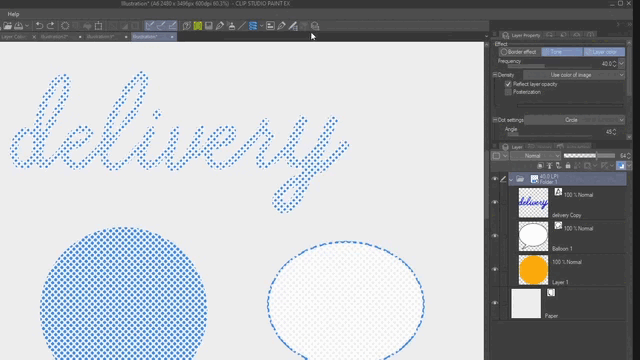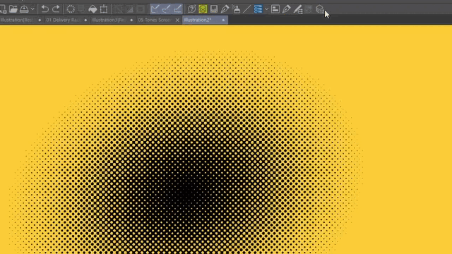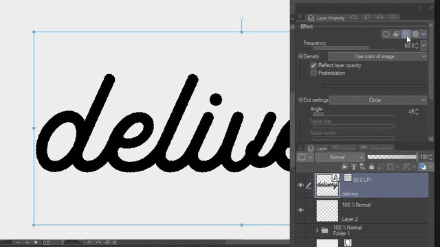 Vous pouvez convertir n'importe quel texte ou image en trames ou similigravures en sélectionnant le calque ou le dossier et en cliquant sur l'effet Trame dans la palette Propriétés du calque. Il représentera toutes les valeurs d'une image avec des formes ou des points en noir et blanc.
