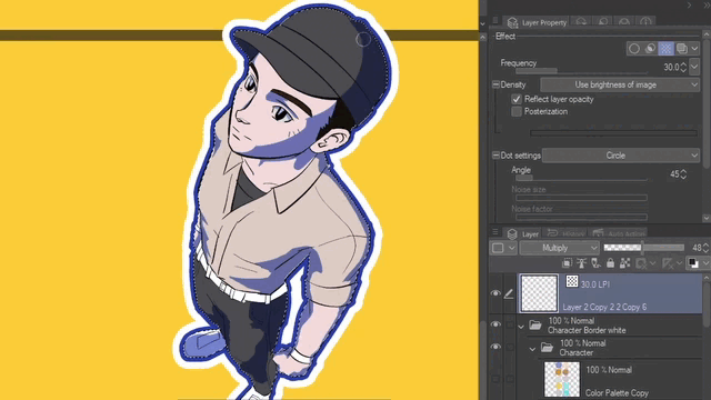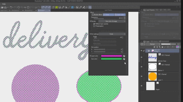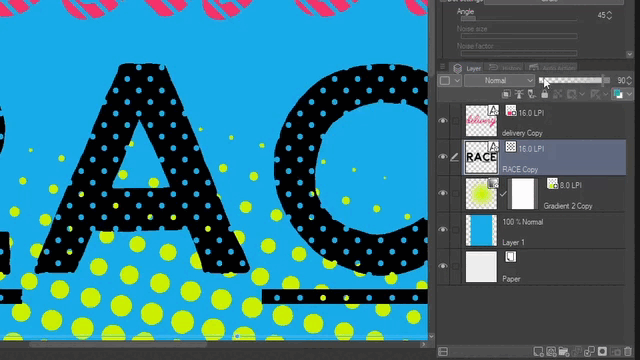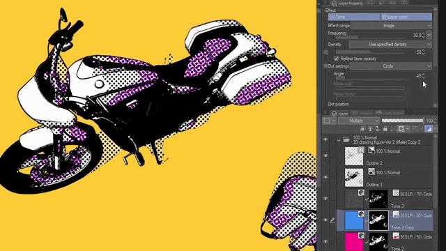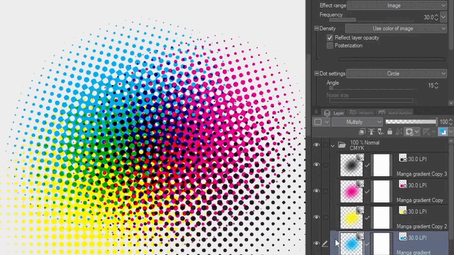 Ensuite, vous pouvez éditer les calques de trame et changer l'angle et les couleurs avec la couleur du calque pour superposer les points comme nous l'avons vu précédemment. Par défaut, les trames sont réglées à 45 degrés, alors changez les calques dupliqués à l'un des autres degrés 0, 15 ou 75.