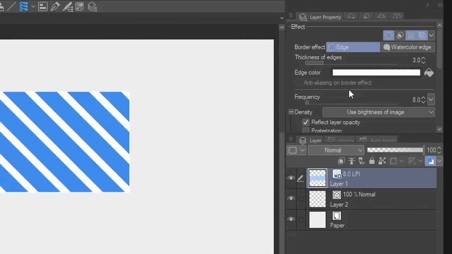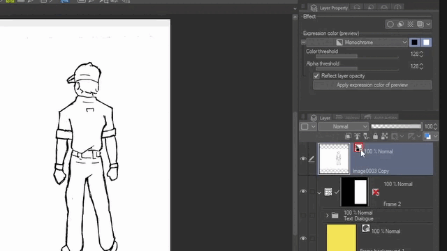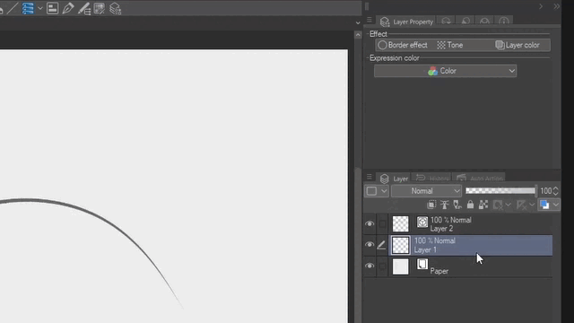 Avec Clip Studio PRO, vous verrez toutes les fonctionnalités à l'exception de l'extraction de lignes. Ces options changeront en fonction du calque que vous avez sélectionné. Certains paramètres seront visibles et utilisables, d'autres non. Par exemple, pour les calques matriciels et vectoriels, il affichera les trois mêmes effets standard et options de couleur d'expression. Mais pour le papier, il n'affichera que la couleur du calque.