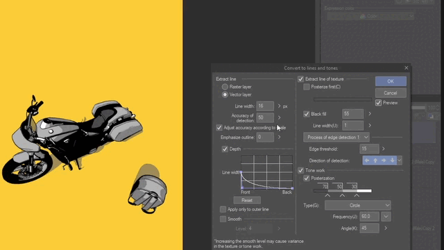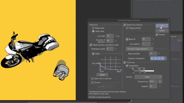 Une fois que vous cliquez sur le bouton Convertir en lignes et trames, cela se transforme en une puissante combinaison d'extraction de lignes avec profondeur, remplissage noir monochrome et trames. Vous pouvez également décider si vous souhaitez obtenir vos lignes dans un calque raster ou vectoriel, ce qui vous permettra de modifier les lignes plus tard si vous le souhaitez. Pour voir les changements, cochez la case Aperçu.