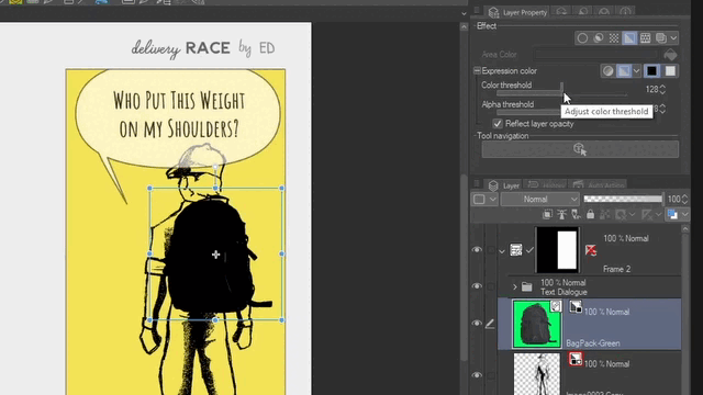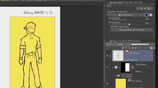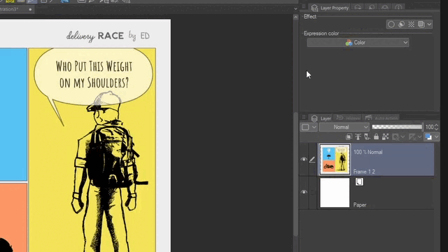 Voici la dernière version des trois cases de bande dessinée où certaines des fonctionnalités que nous avons vues ont été utilisées. Certaines d'entre elles sont l'effet Double bordure, la couleur d'expression Monochrome pour extraire les lignes et les remplissages noirs et la couleur des objets fichier avec la couleur du calque.
