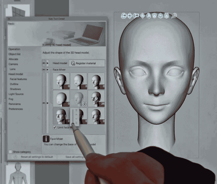 Accédez à cette fonction en cliquant sur le bouton des paramètres, révélant une sélection diversifiée de visages de personnages préfabriqués. La magie opère lorsque vous mélangez et assortissez ces visages à l'aide du curseur, et pour une touche plus personnalisée, vous pouvez même affiner les traits faciaux individuels. C'est une révolution qui ajoute une toute nouvelle dimension de créativité à votre processus de conception de personnages 3D !