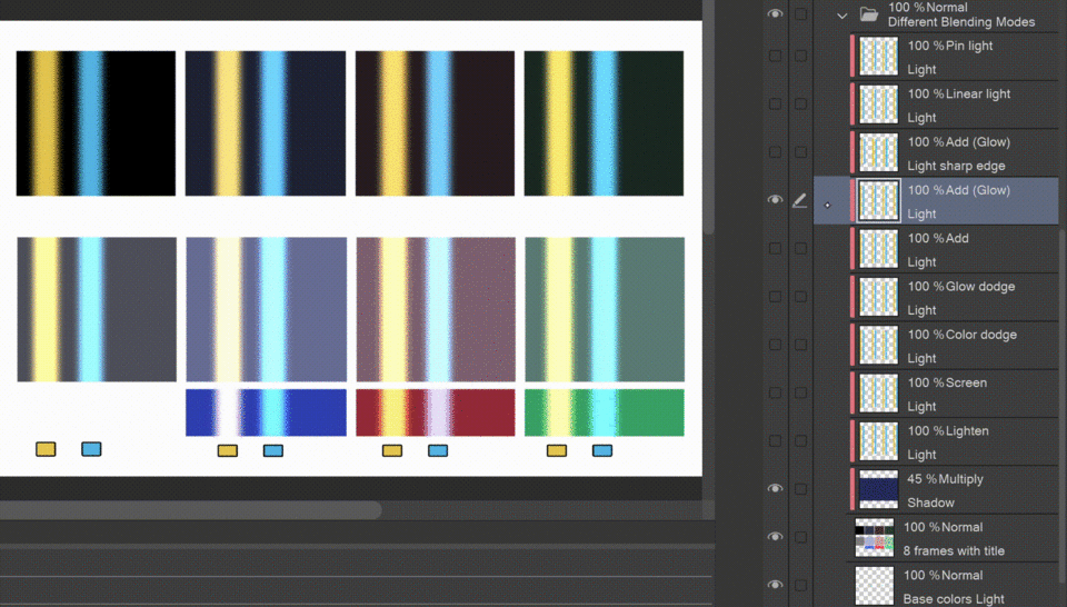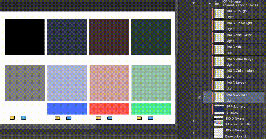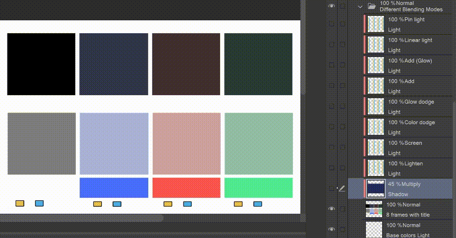 Je vous présente d'abord comment ces deux couleurs s'adaptent à chaque couleur de base sans ajouter de calque Produit en dessous.