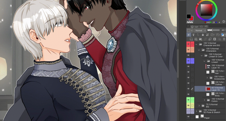 Pour que les étapes suivantes fonctionnent, il est important que les calques des personnages (lineart et couleurs) soient tous dans un seul dossier ou fusionnés.