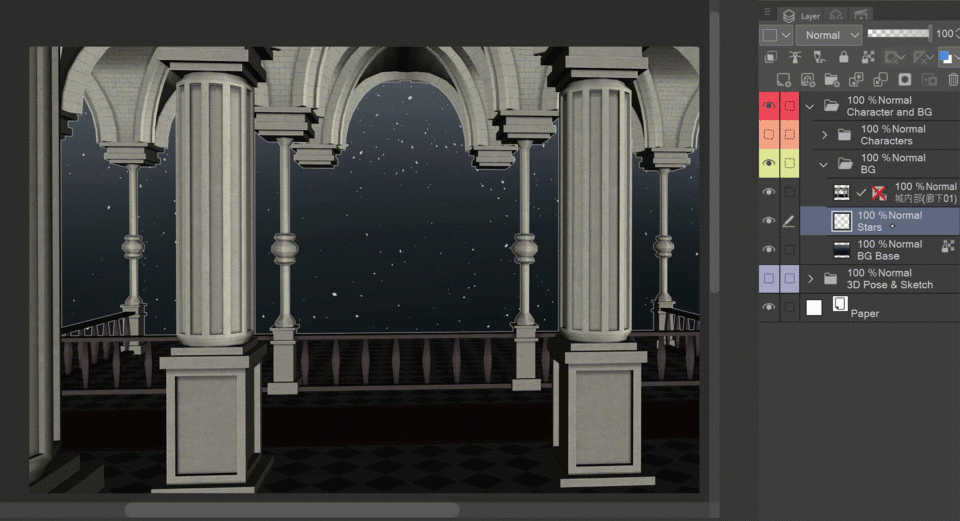 Maintenant, je vais ajouter des étoiles sur un calque séparé au-dessus de la couleur de base à l'aide d'un aérographe à saupoudrer.