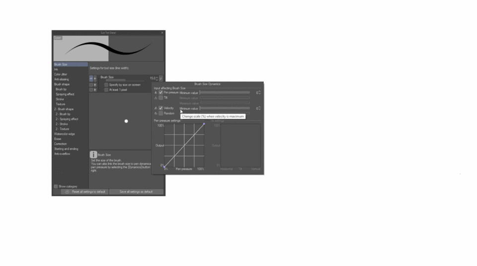 Pour cette fonction, la Vélocité contrôle la taille de votre pinceau en fonction de la vitesse à laquelle vous déplacez votre stylet. Essentiellement, plus vous dessinez vite, plus la taille du pinceau diminue, tandis que plus vous dessinez lentement, plus la taille du pinceau reste proche de sa taille originale. Si vous bougez rapidement au début et ralentissez à la fin, cela créera deux points à chaque extrémité. Cette fonction opère davantage comme un pinceau texturé et est utilisée pour imiter les vrais stylos encreurs dans votre dessin numérique.