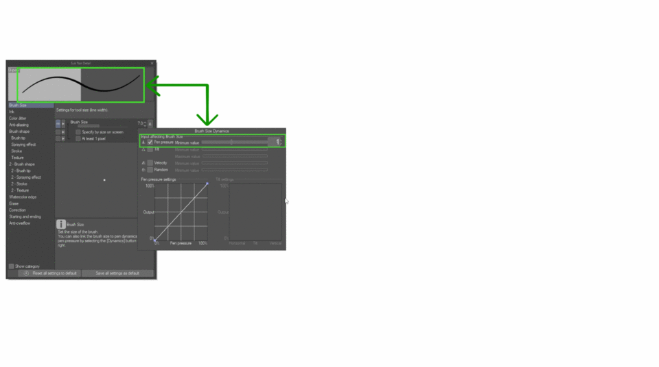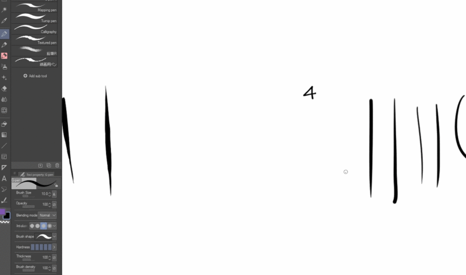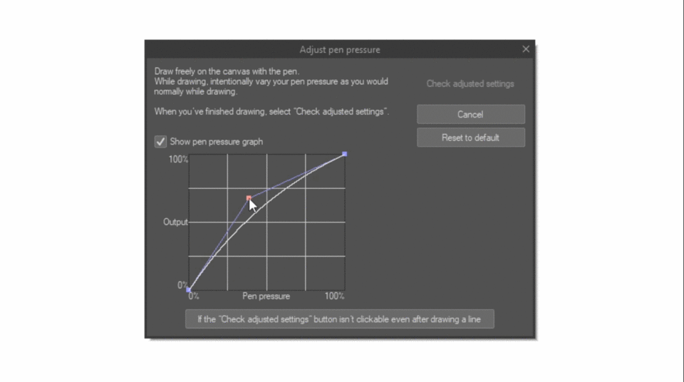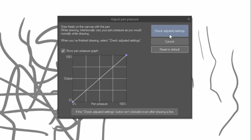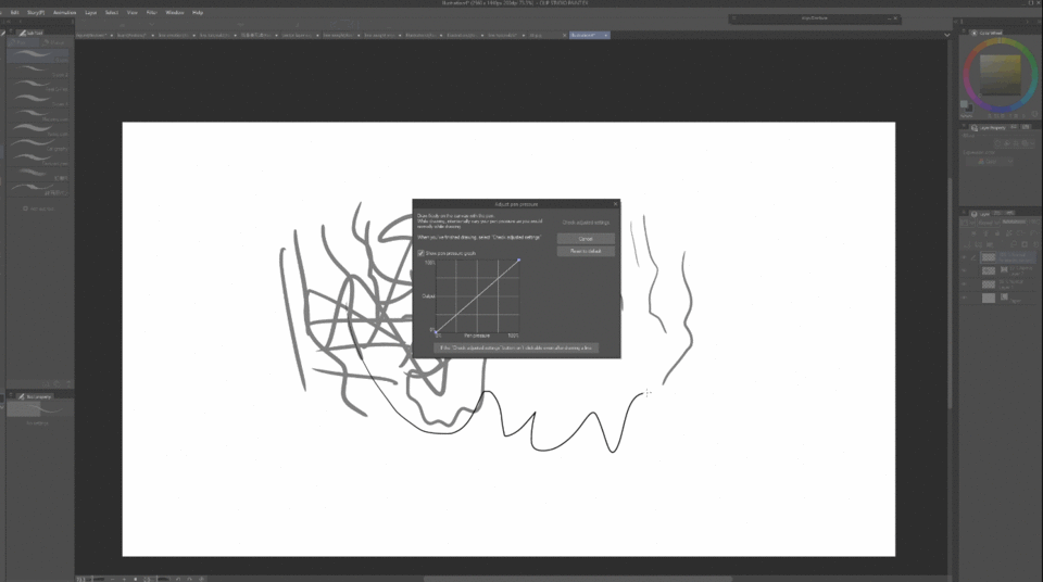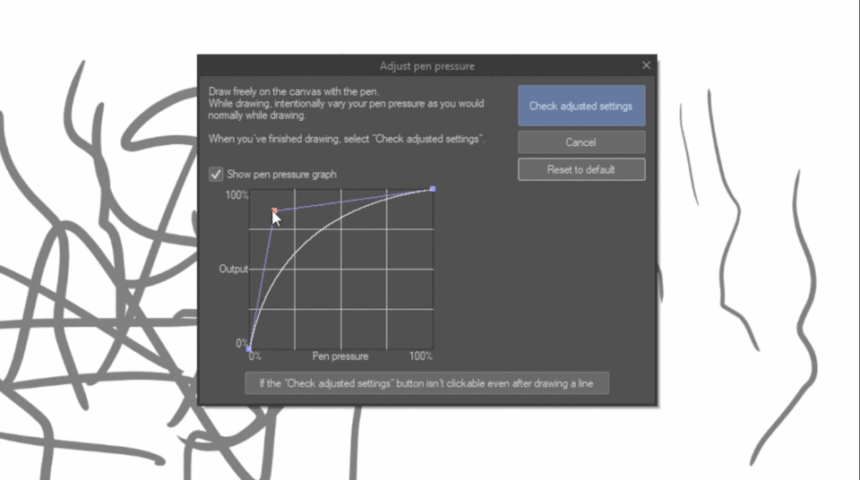 Dans de tels cas, vous pouvez laisser Clip Studio ajuster automatiquement le réglage de pression optimal pour vous en dessinant intentionnellement avec une variété de pressions de stylet sur la toile, mais cette méthode peut être subjective car certaines personnes ne la trouvent pas utile.