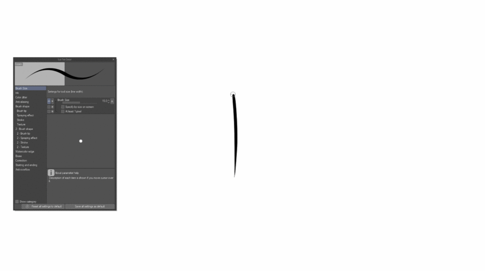 Cependant, certains artistes ne trouvent pas les réglages par défaut à leur goût car les lignes ont tendance à s'amincir trop facilement aux extrémités lorsqu'ils dessinent. Dans de tels cas, vous pouvez augmenter la valeur minimale de l'épaisseur de ligne pour éviter que les lignes ne deviennent trop fines.