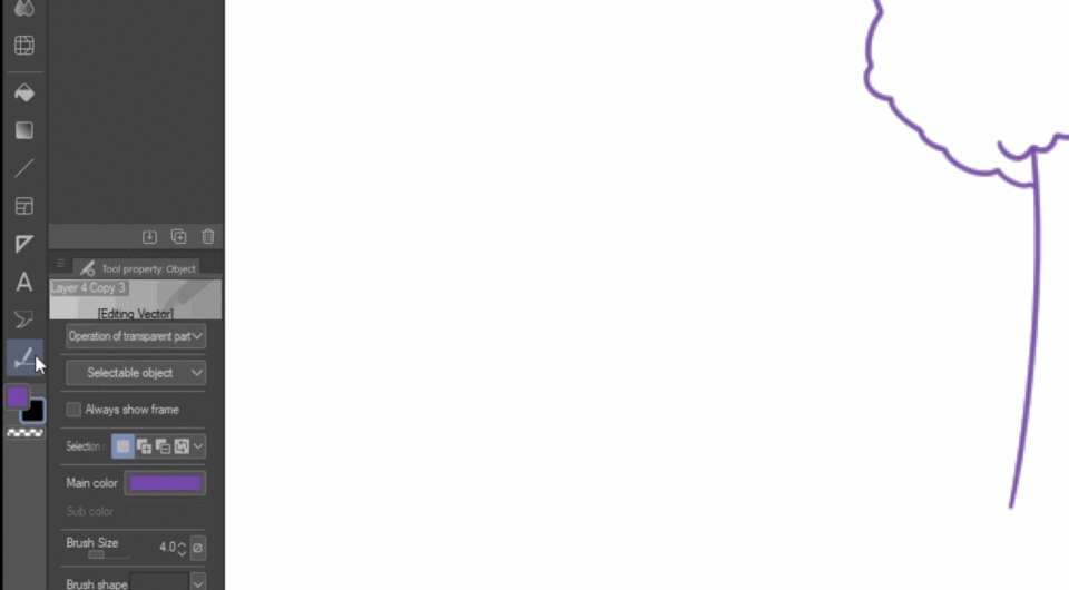 De plus, vous pouvez également utiliser le sous-outil 'Redessiner la largeur de ligne vectorielle' pour ajuster la largeur de ligne de manière transparente. Cet outil réagit à la pression du stylet : appuyer plus fort épaissit la ligne tandis qu'appuyer plus doucement l'affine. Si vous augmentez ou réduisez la taille de votre pinceau, l'épaisseur globale de la ligne s'adaptera en moyenne en conséquence.